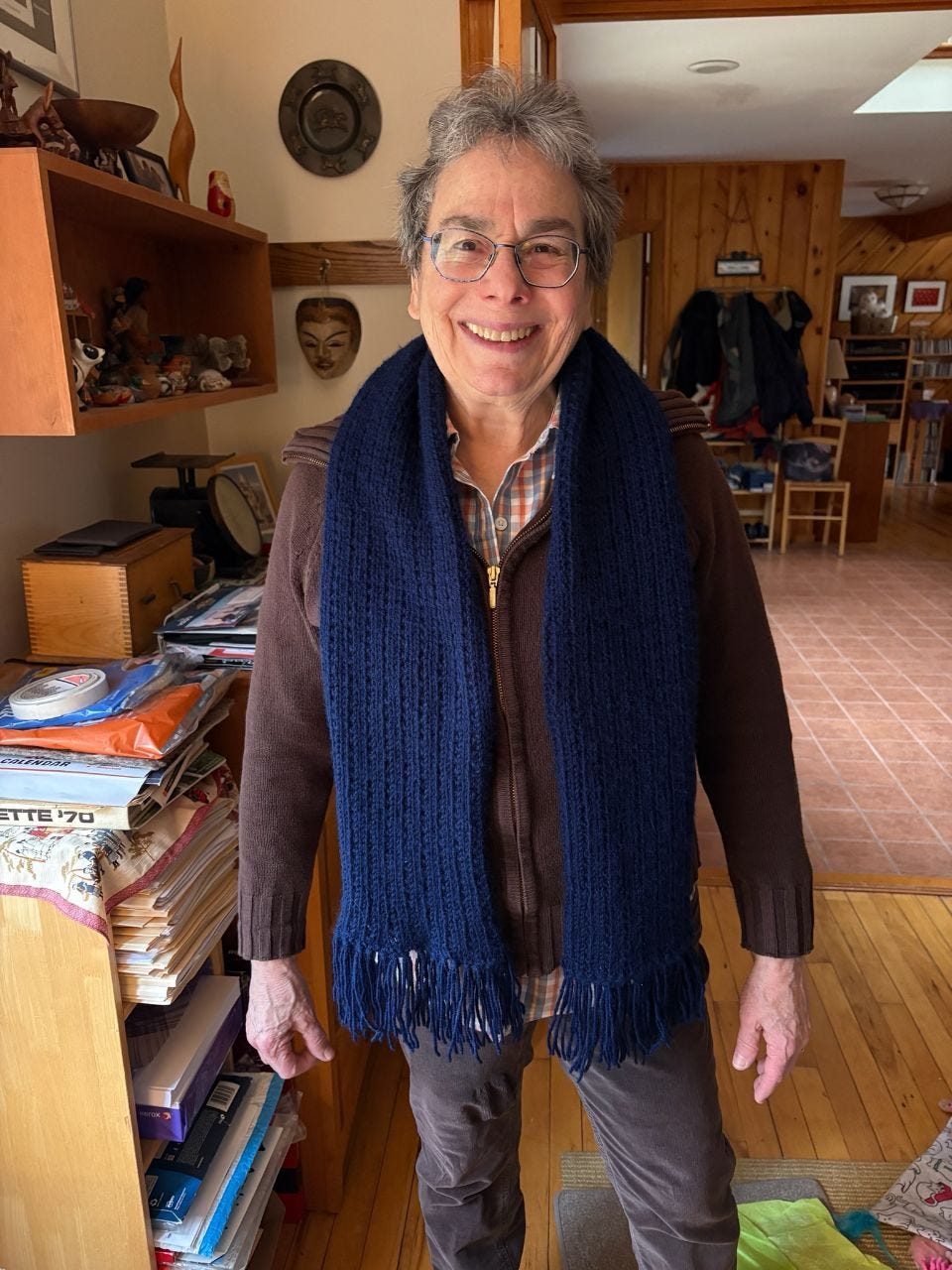 Cindy handed me a dark blue scarf that was knitted in a railroad stich – to commemorate my love of travel. She added tassels to the end of the scarf.